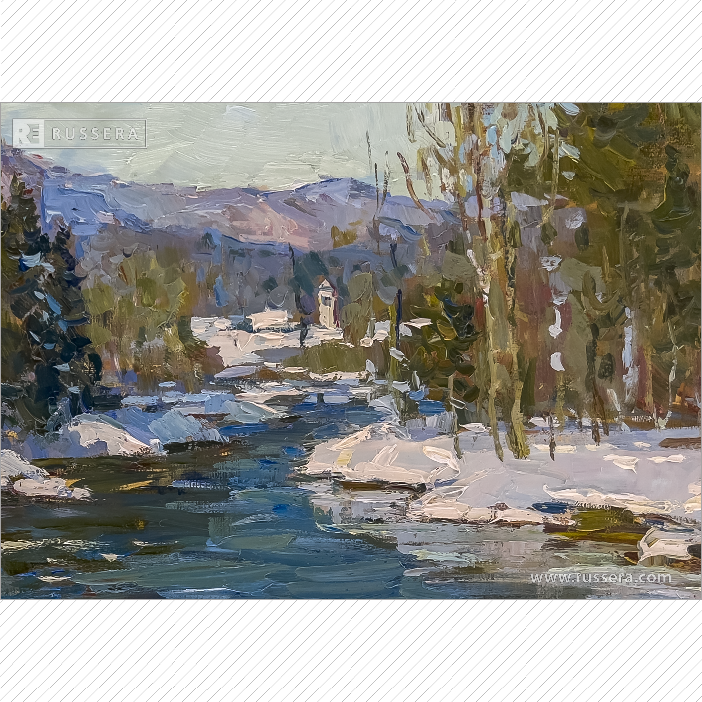 Plein air artwork by Irina Rybakova. It was painted in March 2020 in Belvedere, Vermont. Being one of many wooden covered bridges in Vermont, this one was built over a century ago, in 1890, and listed in National Register of Jistoric Places.